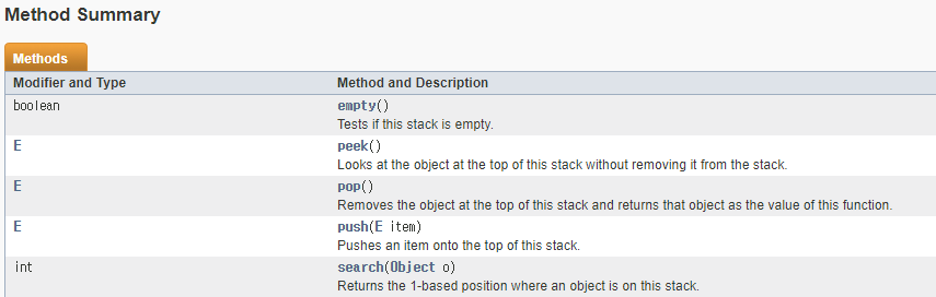 출처 : https://docs.oracle.com/javase/7/docs/api/java/util/Stack.html ->스택은 java.util.Vector<E> 클래스를 상속하기 때문에 여러 다양한 메서드를 호출하거나 재정의하여 편리하게 사용할 수 있다.
