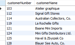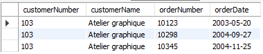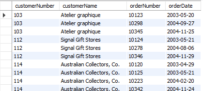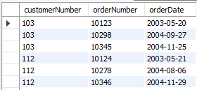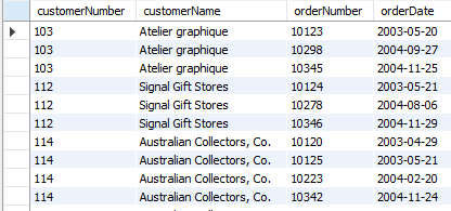 결과 -- 103번 ~ 120번 고객의 주문 내역 select c.customerNumber, c.customerName, o.orderNumber, o.orderDate from customers c join orders o on c.customerNumber = o.customerNumber where c.customerNumber between 103 and 120;