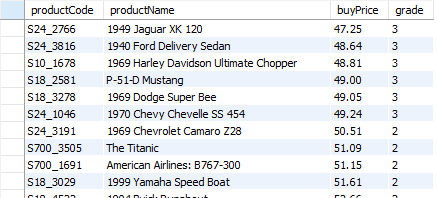 -- 각 상품의 퀄리티를 다음과 같은 조인 조건을 만족하며 조합하라. select productCode, productName, buyPrice, grade from products join quality on buyPrice >= low and buyPrice <= high order by buyPrice;