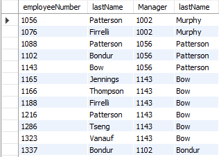 -- 직원과 직원의 매니저(보고하는 대상) select e.employeeNumber, e.lastName, m.employeeNumber as "Manager", m.lastName from employees e join employees m on e.reportsTo = m.employeeNumber;