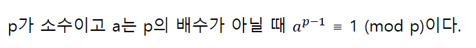 페르마의 소정리 쉽게 말해 a^(p - 1)과 1을 p로 나눈 나머지는 같다, 즉, a^(p - 1)의 나머지는 1이다라는 말이다.