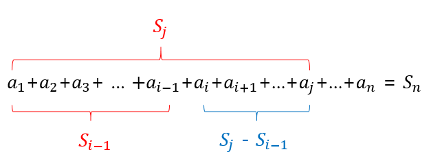 그림과 같이 n항 까지의 합을 Sn이라고 정의한다면, 구간 [i, j]의 구간합은 Sj와 Si-1을 뺀 값을 구하여 바로 구할 수 있다. 즉, Sn까지의 구간합을 모두 구해 놓기만 한다면(O(M)) 구간 합을 구하는 연산 자체는 O(1)의 시간이면 구할 수 있기 때문에 결론적으로 O(N + M)의 시간 복잡도를 갖는 구간 합을 구하는 연산을 만들 수 있다.