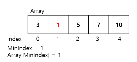 초기 배열 상태 우선, 첫 번째 원소의 값을 기억해두고 1번째 인덱스부터 4번째 인덱스까지 더 작은 값이 나올때마다 해당 위치의 인덱스를 기억해둔다. 따라서 우선 Array[MinIndex]에 대하여 Array[1]의 값을 비교하면 Array[1]의 값이 작기 때문에 Array[1]의 인덱스인 1을 기억해둔다.