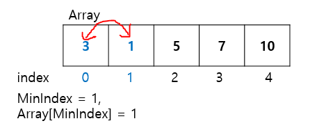Array[MinIndex] < Array[3], Array[MinIndex] < Array[4] 이므로 MinIndex는 따로 갱신되지 않는다. 이렇게 한 번의 탐색이 완료되었을 때 최종적으로 해당 배열에서 가장 작은 값은 1번째 인덱스에 있는 값임을 알 수 있다. 따라서, 해당 값을 배열의 0번째 원소와 바꾸어 준다.