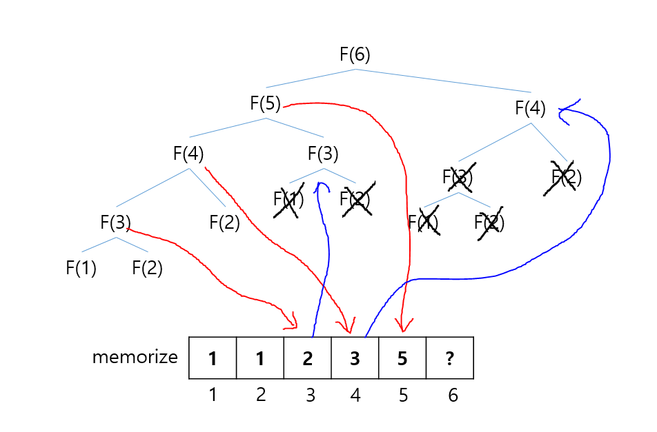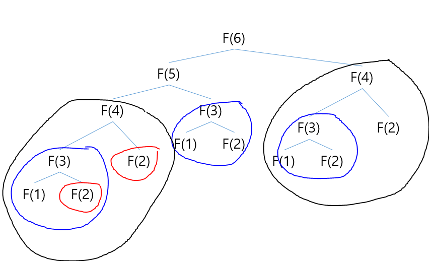 일반적인 재귀를 사용한 경우 재귀 호출 구조도와 반복되는 부분 확인 그림과 같이 호출이 반복될 때 마다, 이미 구했던 값임에도 불구하고 다음 재귀에서 반복해서 재귀 호출이 발생하는 것을 확인할 수 있다. 이 경우 시간 복잡도는 O(2^N)이라고 한다. 즉, 연산의 횟수가 N이 늘어남에 따라 지수배 만큼 늘어나기 때문에 효율적인 구현이라고 볼 수 없다.