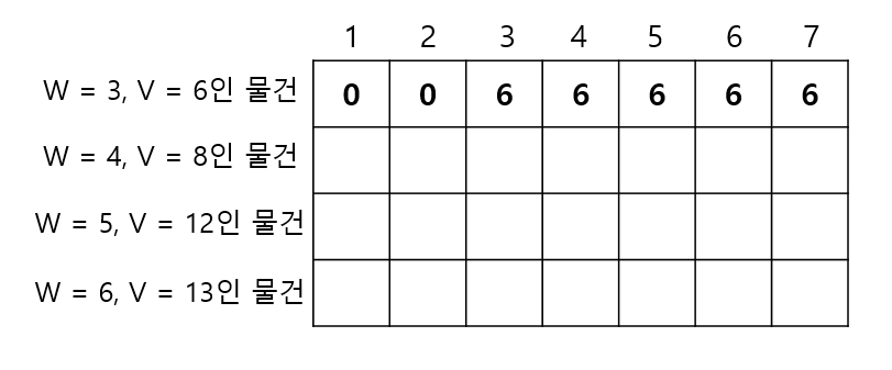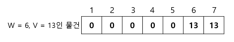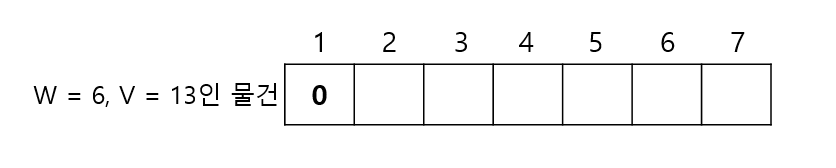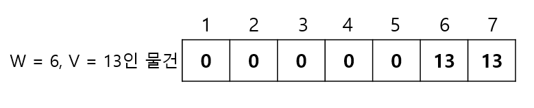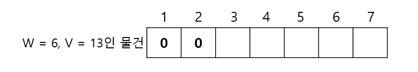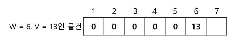 1부터 7까지의 무게에서, 무게는 6이고 가치는 13인 물건을 넣을 때 각 무게에서의 최대 가치는? ->우선 무게가 1인 경우, 해당 물건을 넣을 수 없으므로 다음과 같이 테이블을 채울 수 있을 것이다.