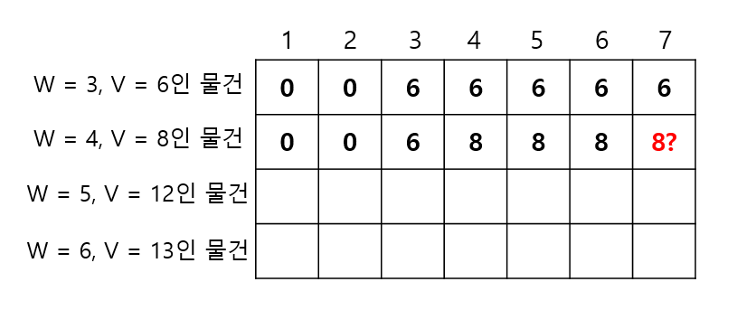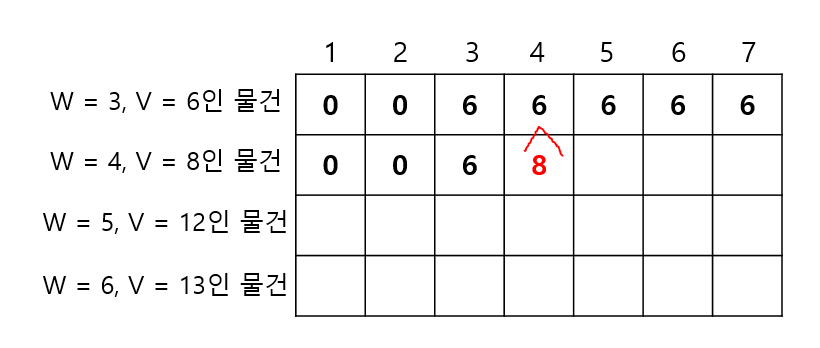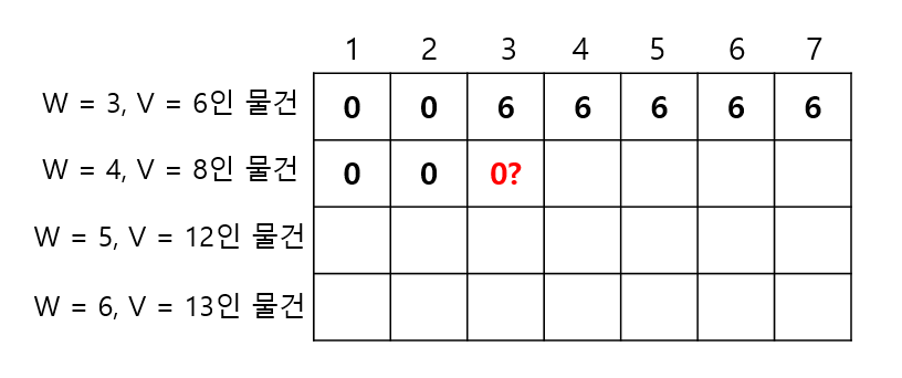 ->이제, 무게가 4이고 가치가 8인 물건을 앞선 방식으로 넣어보자. 우선 무게가 1인 경우 물건을 담을 수 없으므로 가치는 0일 것이다. 이는 무게가 3인 경우까지 반복 될 것이다. 그런데 무게가 3이 되는 지점에 0을 채우는 것이 과연 맞을까?