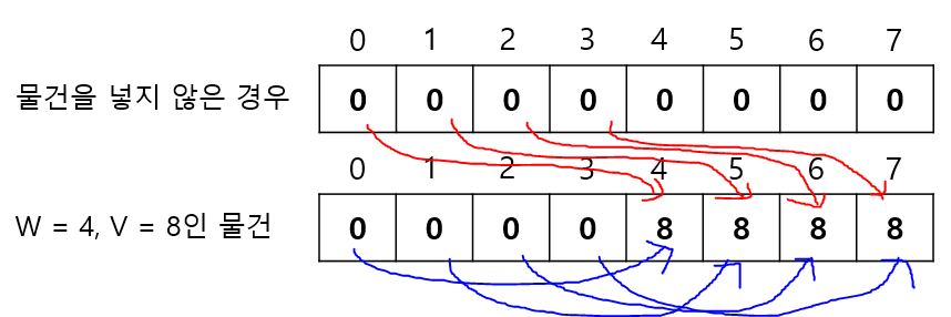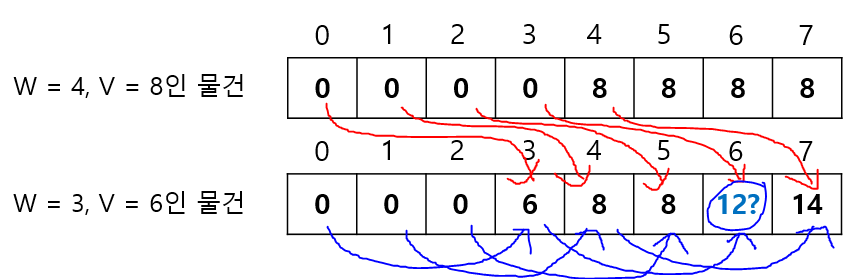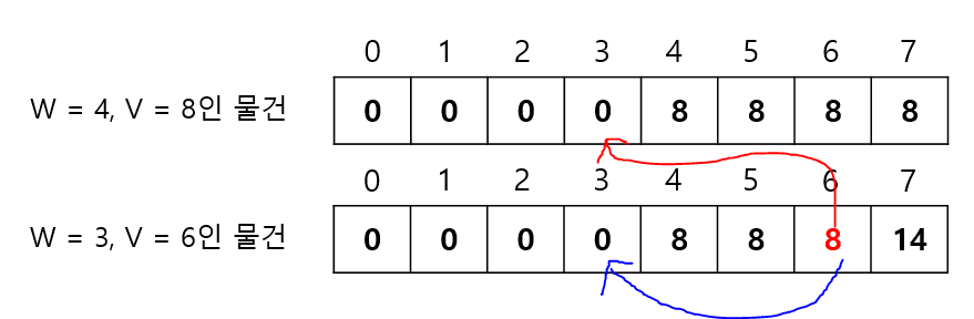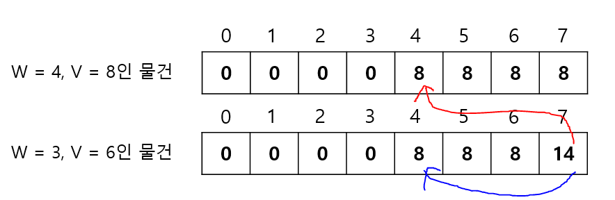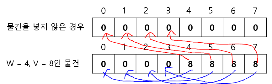이해를 돕기 위해 무게 7부터 차근차근 생각해보겠다. 마찬가지로 2차원 배열을 사용하는 방식이었다면, 빨간색 화살표와 같이 값을 참고할 것이고, 1차원 배열을 사용하는 방식이라면 파란색 화살표와 같이 값을 참고할 것이다.