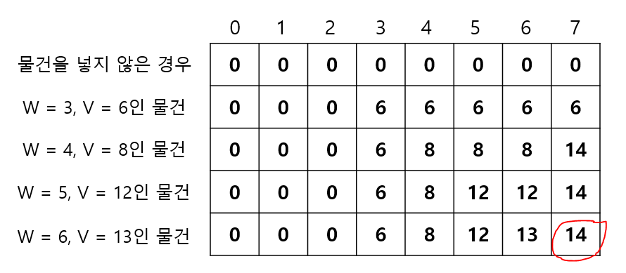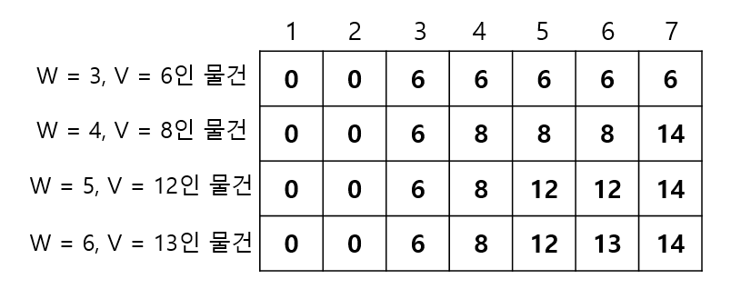 ->같은 방식으로 무게가 5인 경우까지 0으로 채울 수 있고, 무게가 6이 되는 순간 물건을 넣을 수 있으므로 무게가 6인 경우는 가질 수 있는 최대 가치가 13이 된다.