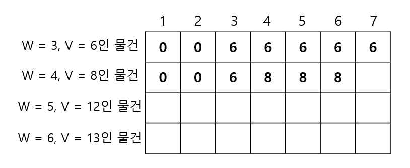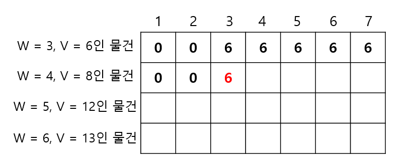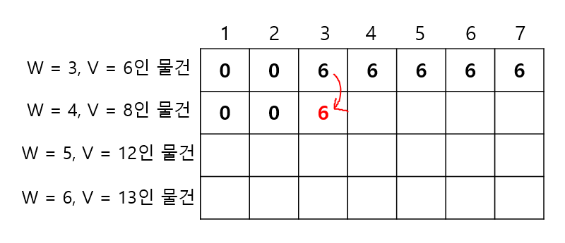 ->이번에는 편의상 이해를 돕기 위해, 무게가 3이고 가치가 6인 물건과 무게가 4이고 가치가 8인 문제를 먼저 넣는다는 가정하에 테이블을 갱신해보자. 우선, 무게가 3이고 가치가 6인 물건은 앞의 논리대로 테이블을 채웠다고 생각한다. 그렇다면 아래와 같은 상태일 것이다.