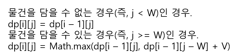 ->앞선 과정을 똑같이 진행해보자. 우선, 첫 번째 물건을 넣는 경우를 생각해보자.