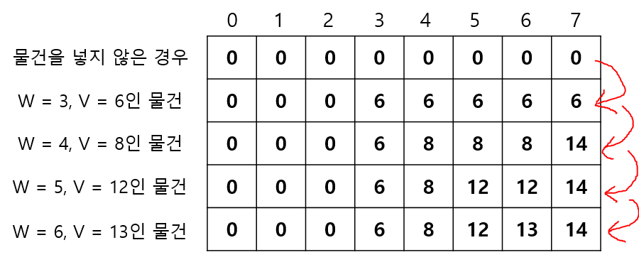 ->마찬가지 방식으로 하면 무게 6까지 같은 방식으로 비교하며 값을 채워나갈 수 있음을 알 수 있다.