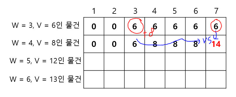 ->자, 이제 무게가 7인 경우가 관건이다. 앞선 방식을 활용한다면 해당 위치에는 8이라는 가치가 들어가야 할 것이다. 하지만 우리는 직관적으로 무게가 7인 경우 첫 번째 물건과 두 번째 물건을 모두 넣을 수 있으므로 해당 위치에는 14라는 가치가 들어가야 한다는 것을 알고 있다. 즉, 기존에 사용하던 규칙에서 조금 수정이 필요함을 알 수 있다.