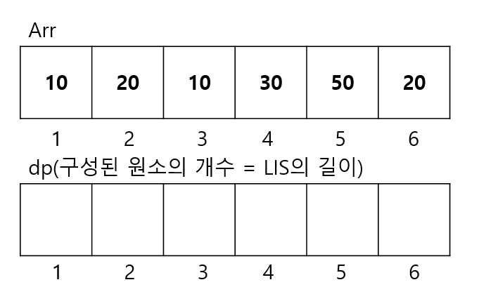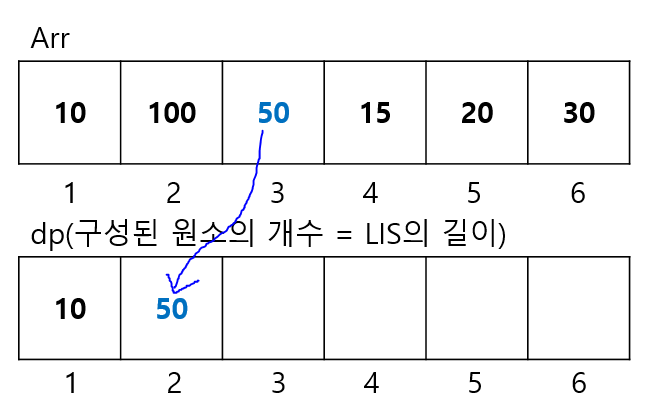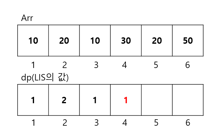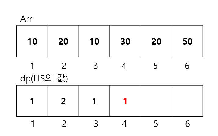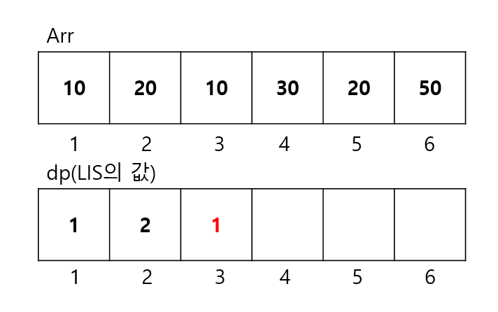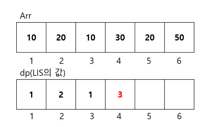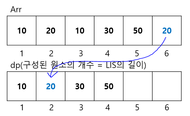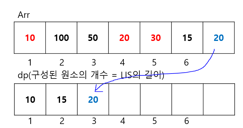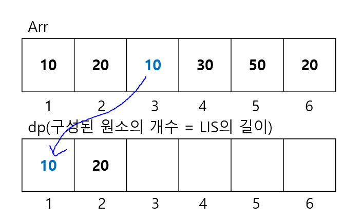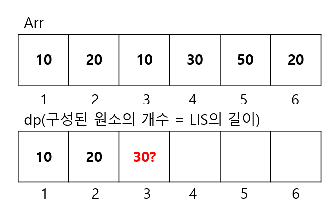 우선 우리는 지금까지 Arr 배열에 주목하여 30이 부분 수열의 길이를 늘릴 수 있는지 판단하였다. 하지만 앞서 말했듯이 뭔지는 모르겠지만 dp 테이블의 원소들의 값은 30이 부분 수열의 길이를 늘릴 수 있는지 판단할 정보를 제공하고 있다고 하였다. 우리가 Arr 배열을 보면서 판단한 정보는 부분 수열 10, 20이 현재 가장 긴 LIS를 갖는 수열임을 확인했을 것이다. 그런데 확인해보면 dp 배열에도 10, 20의 값이 저장되어 있음을 알 수 있다. 우리는 이 정보로부터 30이라는 숫자가 부분 수열의 길이를 늘릴 가능성이 있음을 파악할 수 있다. 그런데 여기서 주의할 점은, dp 배열에 저장된 값들이 현재까지 원소들을 조사하며 만들어진 LIS 배열 그 자체라고 생각하면 안된다.
