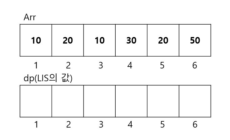 ->따라서, 해당 위치에서 해당 원소가 가질 수 있는 LIS의 값을 저장할 1차원 dp 테이블을 만들고 문제에 접근해보자. 아래 그림을 참고하도록 하자.