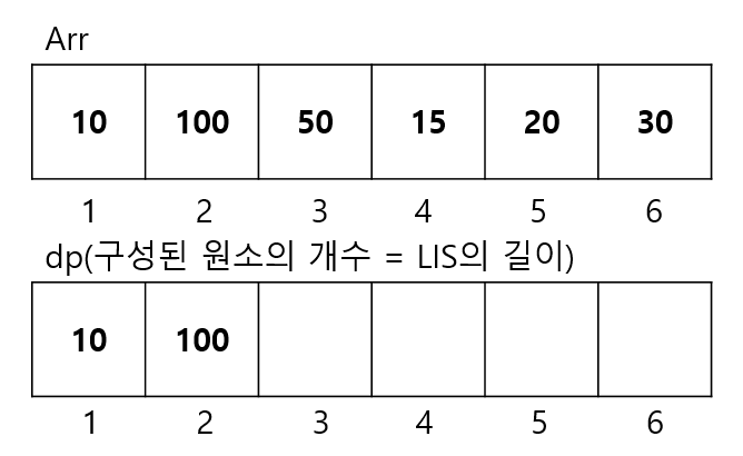 만일 이러한 갱신이 진행되지 않는다면 어떻게 될까? 우선 직관적으로 보았을 때, 해당 수열에서 최종 LIS 배열은 {10, 15, 20, 30}으로 구성될 것을 알 수 있다. 그리고 우리는 dp 배열 만을 바탕으로 현재 위치의 수가 부분 수열의 길이를 늘릴 가능성이 있는지 파악하겠다고 하였다. 하지만 앞선 갱신과정이 진행되지 않는다면, 2번째 원소의 위치에는 100이라는 값이 저장되어 있을 것이고 뒤에오는 수인 15, 20, 30은 dp 배열만 보았을 때 부분 수열의 길이를 늘릴 여지가 없음을 알 수 있다.