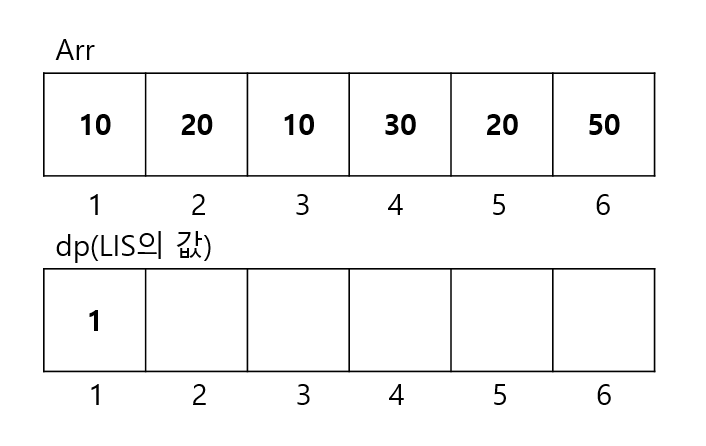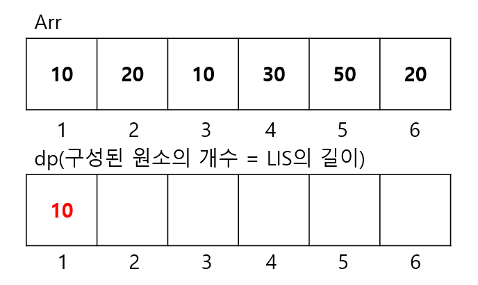 ->우선 첫 번째 원소부터 생각해보면, 당연히 10이라는 값 자체를 dp[1]에 대입해주면된다. 그렇다면 테이블의 정의에 따라 1번째 원소에서 채워진 원소의 총 길이는 1로 LIS의 길이와 같고, 뒤에 조사할 수들이 부분 수열의 길이를 늘릴 가능성이 있는 정보를 제공해준다.