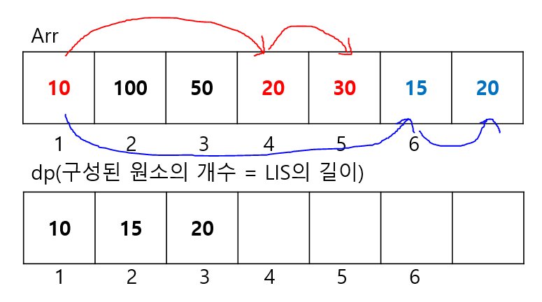 그림에서 확인해보면 LIS 배열은 {10, 20, 30}이 되는 것을 확인할 수 있는데, dp 배열에 저장된 수들과 일치하지 않음을 알 수 있다.