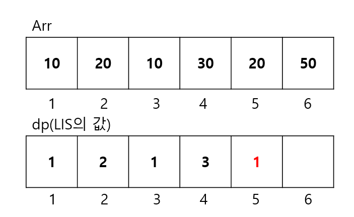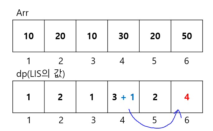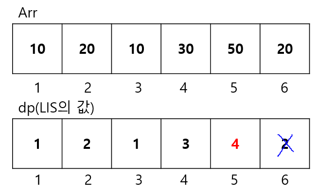 ->여기에서는 Knapsack Problem과 다르게, dp[N]의 값을 최종 답안으로 도출하면 안된다! dp 테이블의 정의를 다시 살펴보면 dp 테이블에 저장된 값은 해당 위치에서 '해당 원소가' 가질 수 있는 LIS의 값이었지, 해당 수열에서 가질 수 있는 LIS가 아니었다는 것에 주의해야 한다. 위의 예시에서 5, 6번째 위치를 바꿔 생각해보면 이해하기 쉽다. 아래 그림을 참고하자.