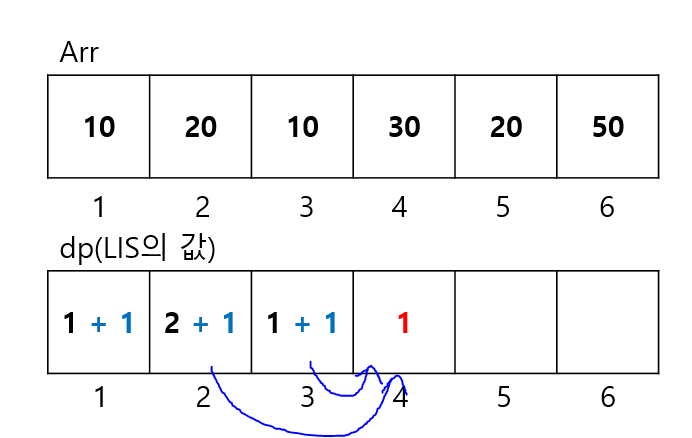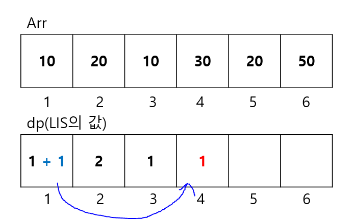 이때, 20이라는 값은 앞선 원소(10, 20, 10, 30)에 대하여 그 값이 10인 경우(1번째, 3번째 원소)에 대해서만 부분 수열의 길이가 증가할 가능성이 있다. 따라서, 해당 위치의 LIS의 값에 본인의 길이를 + 1한 경우만 후보에 올라갈 수 있다.