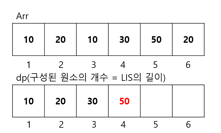 ->우선 5번째 원소에 대하여 dp배열을 계속 추가해보자. 마찬가지로, 해당 위치에서 가질 수 있는 LIS는 4일 것이고, 앞에서 구성된 부분 수열 중 가장 긴 부분 수열은 10, 20, 30으로 구성된 것으로 보아 dp[4]에 50이라는 값을 추가해주면 된다는 것을 알 수 있다. dp 배열에 저장된 원소를 확인해보면, 50이라는 값이 dp 배열에 저장된 모든 원소보다 큼을 알 수 있다.