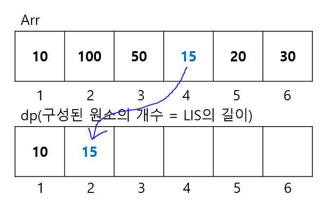 또 반대로 이런 갱신이 이루어 졌다면 2번째 원소의 위치는 위 그림과 같이 15로 갱신이 될 것이고, 그 뒤에 오는 수인 20, 30이 dp 배열만 보고도 부분 수열의 길이를 늘릴 여지가 있다는 것을 확인할 수 있다.
