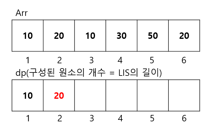 ->다음으로 두 번째 원소를 생각해보자. 2번째 위치에서 LIS의 값은 2이기 때문에, dp[2]는 20을 채우는 것이 당연할 것이다. 또한 이 값들이 이후 3 ~ 6번째 원소의 부분 수열의 길이를 늘릴 가능성이 있는지 파악할 정보가 된다는 것을 기억하라.