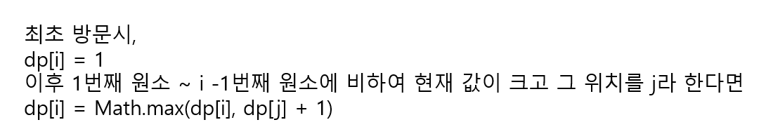 ->위의 규칙성을 점화식으로 세워보자. 우선, 해당 원소의 위치에 방문할 때 마다 해당 위치의 길이는 본인의 길이로 초기화 할 수 있다는 사실을 기반으로 dp[i] = 1로 초기화(기저 조건)할 수 있다는 것을 알 수 있다.