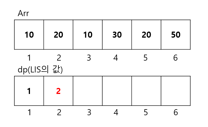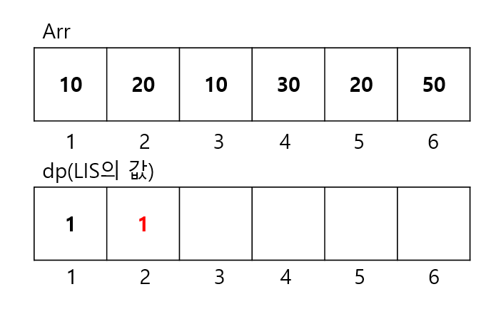 하지만 우리는 우선 직관적으로 해당 위치에서 LIS의 값이 1로 설정되면 안된다는 것을 알고있다. 이전 원소(10)에 비하여 증가하는 상태이므로 해당 위치의 값은 2로 설정되어야 한다는 것을 알 수 있다.